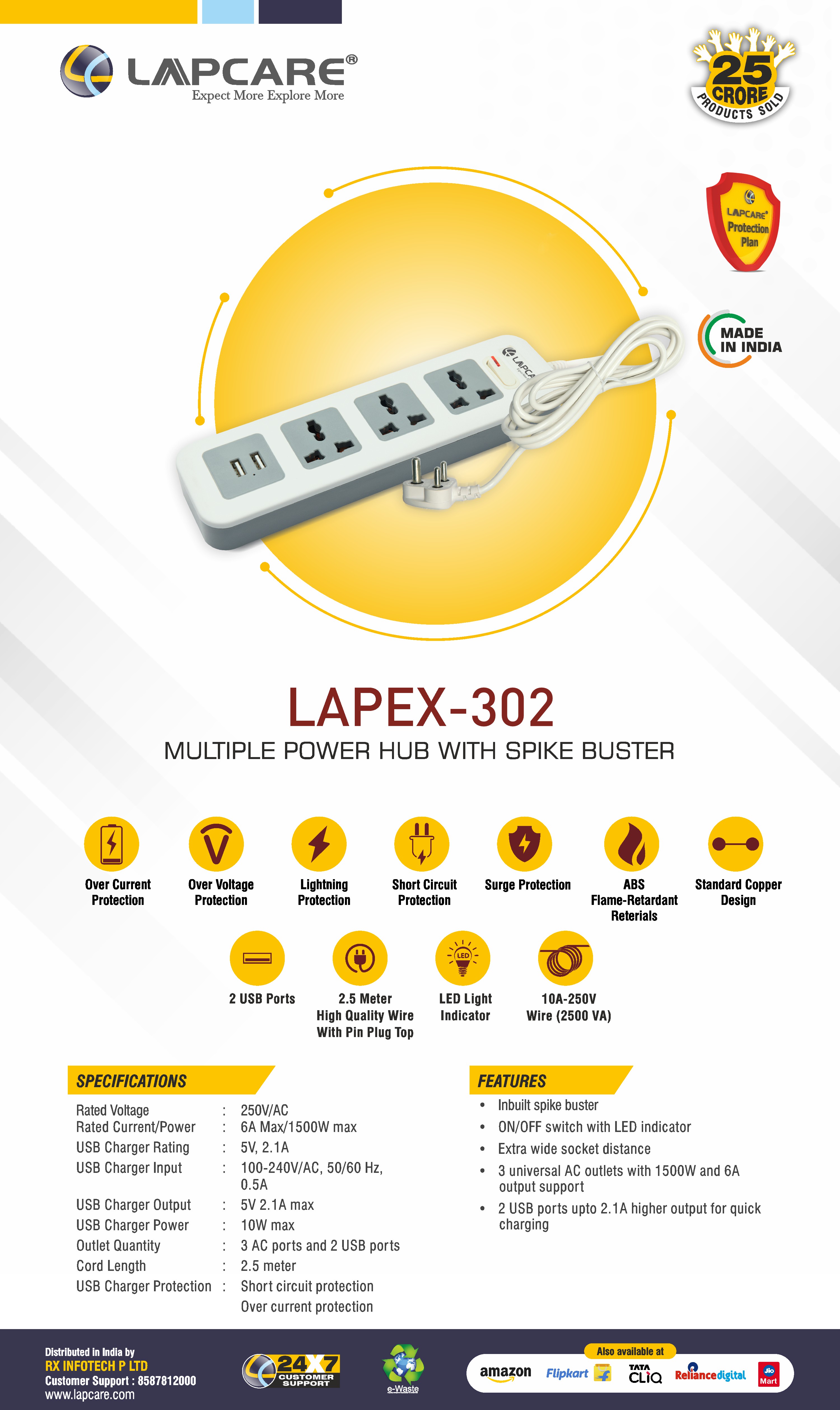 3 Universal Socket | 2 USB-A Port | 1500W Power | 2.5 meter cable | ON/OFF switch