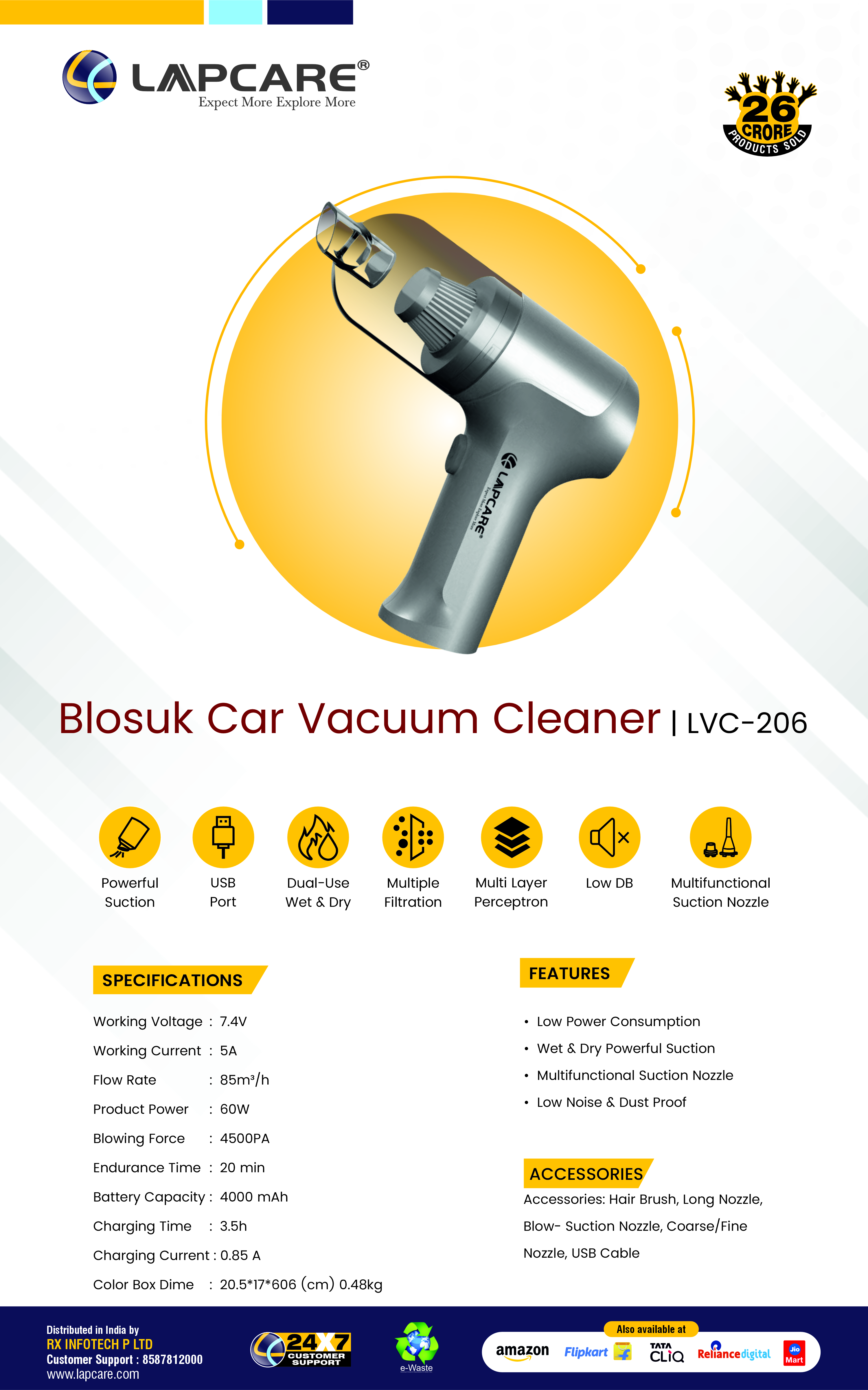 - Accessories : Hair Brush, Long Nozzle, Blow- Suction Nozzle, Coarse/Fine Nozzle, USB Cable.