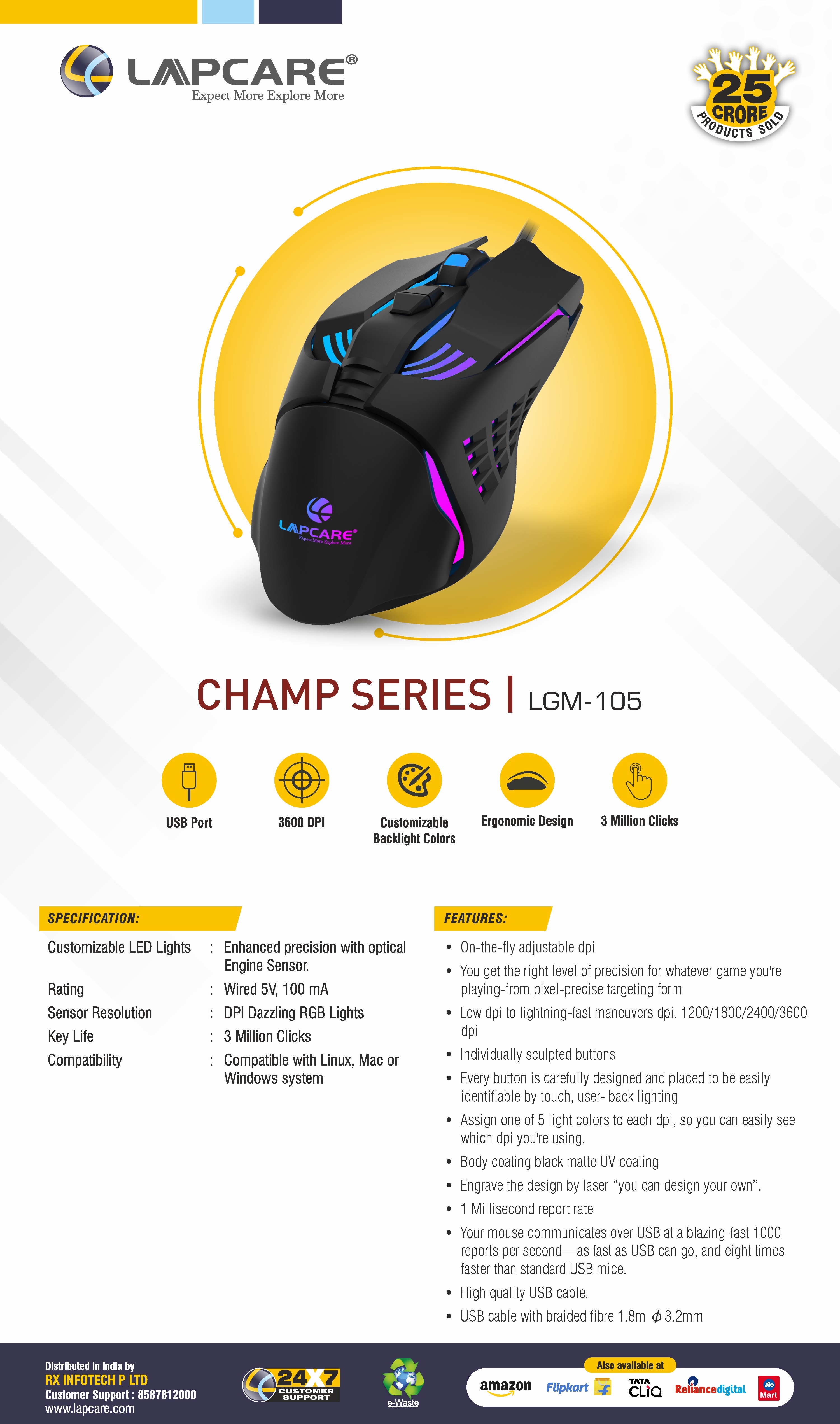 WIRED GAMING MOUSE WITH SIDE BUTTONS;The LAPCARE Chamo LGM-105 is a durable gaming Mouse which delivers up to 3600 DPI (user adjustable 800/1200/1600/2400/3600 DPI).The High-Precision Sensor delivers Pinpoint Accuracy while Micro Switches ensure longevity, greater durability and extreme responsiveness during PC Gaming or Computer editing work.