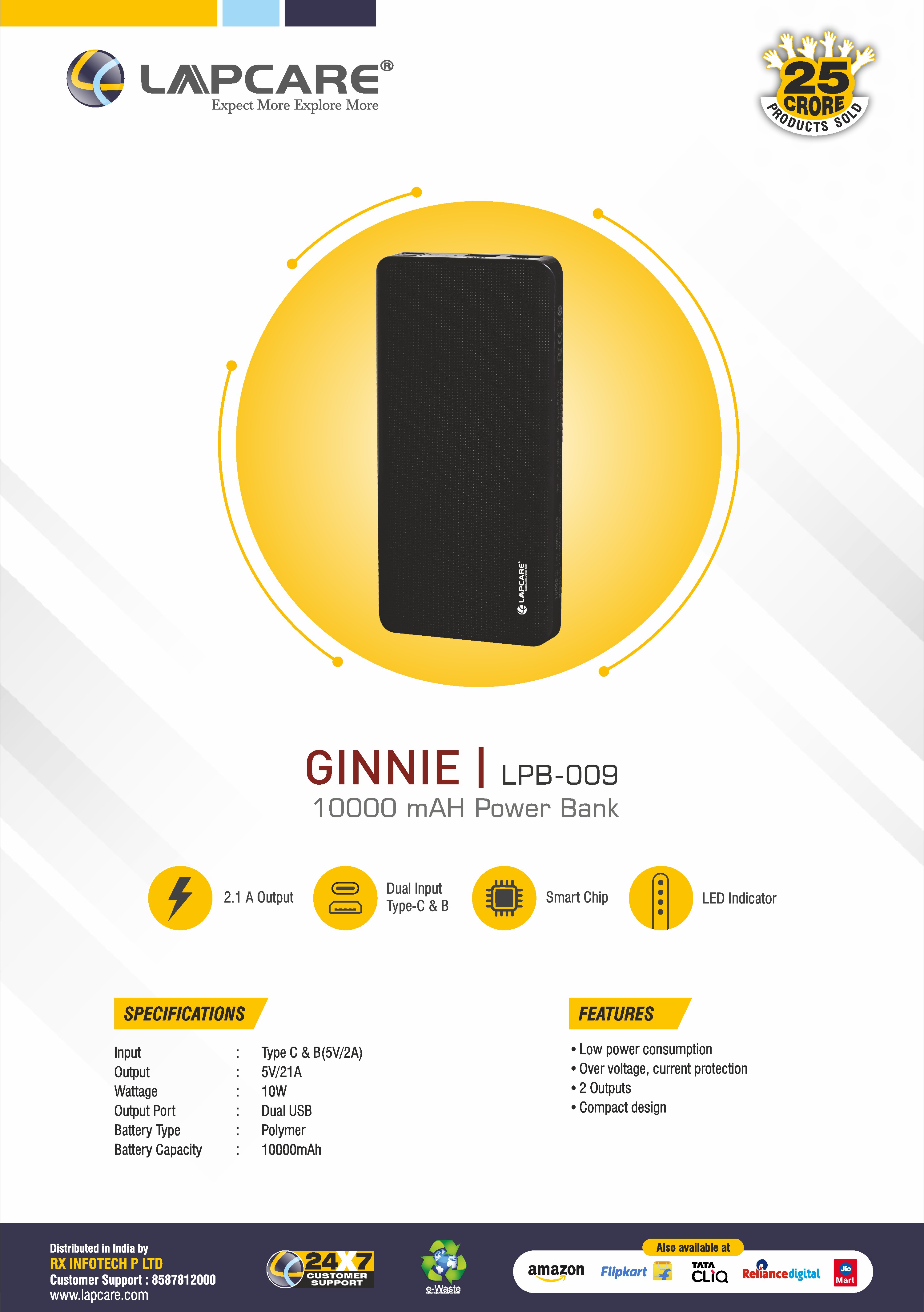 10000mAh Capacity - The LAPCARE Ginne powerbank provides a backup of 10000mAh.