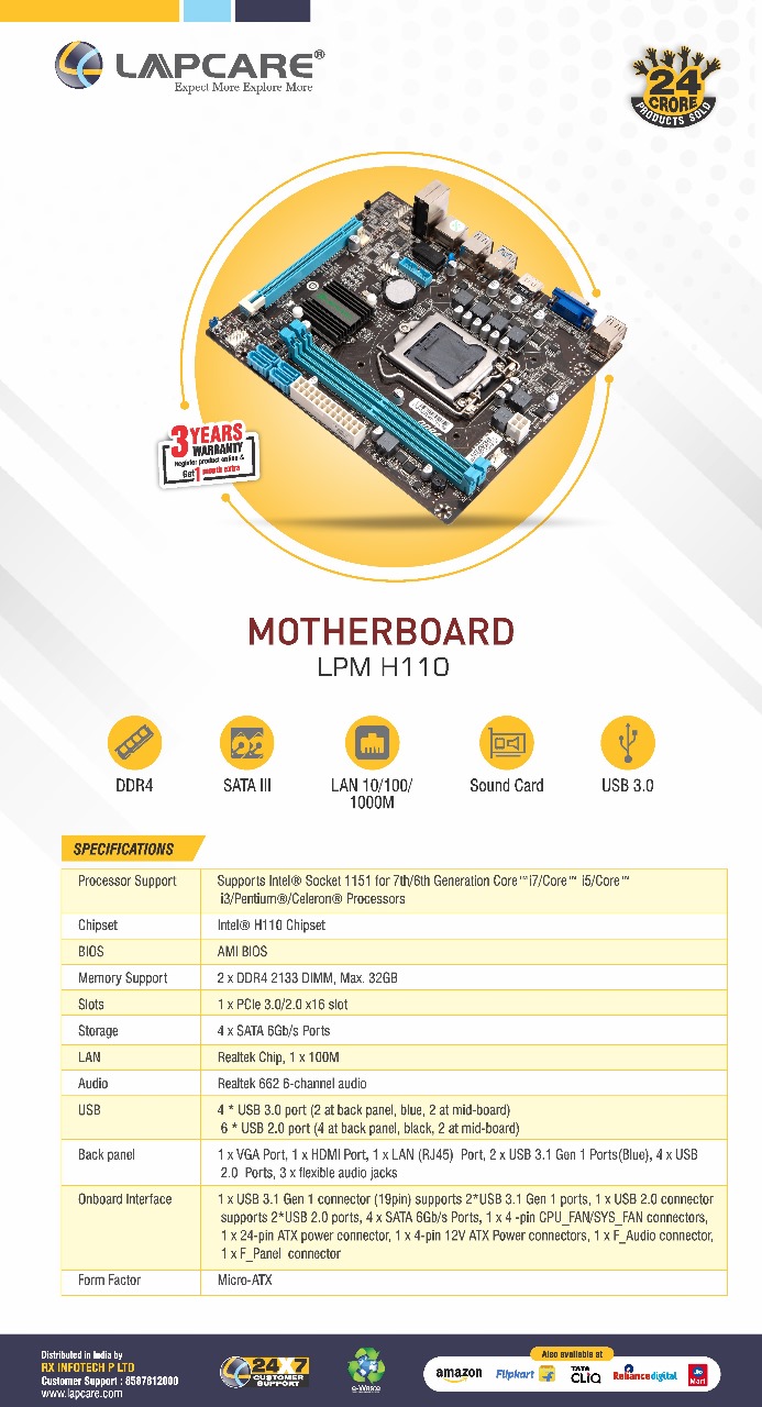 Processor Support : Supports Intel® Socket 1151 for 7th/6th Generation Core™i7/Core™ i5/Core™ i3/Pentium®/Celeron® Processors