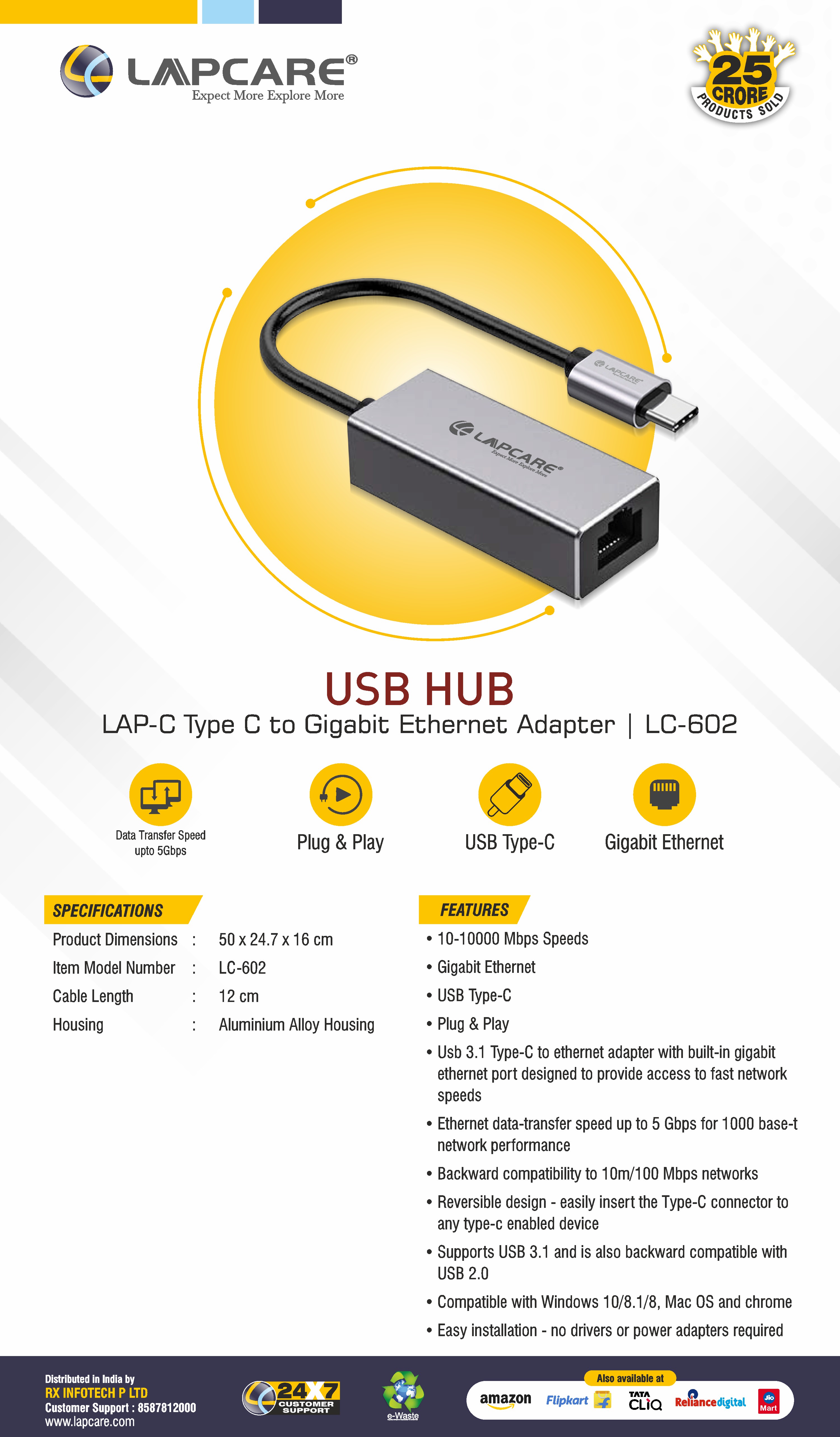 RJ45 Ethernet | Type C Input | Upto 1000Mbps Ethernet Speed | 1M Cable | Plug Play
