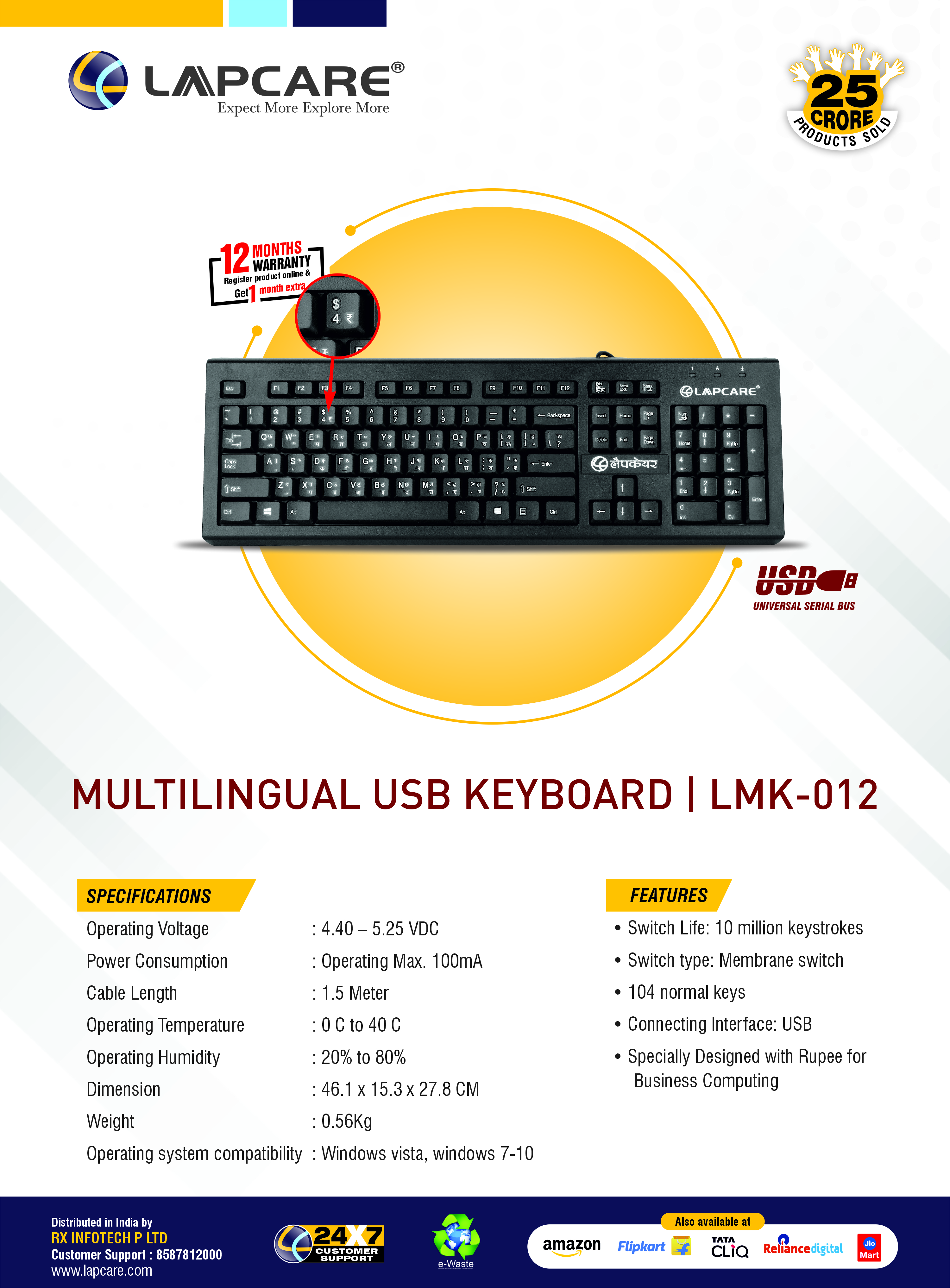 Rupee Key | Spill Resistant | Soft Membrane | 10 Million Keystrokes | 1.5 Meter Long Cable