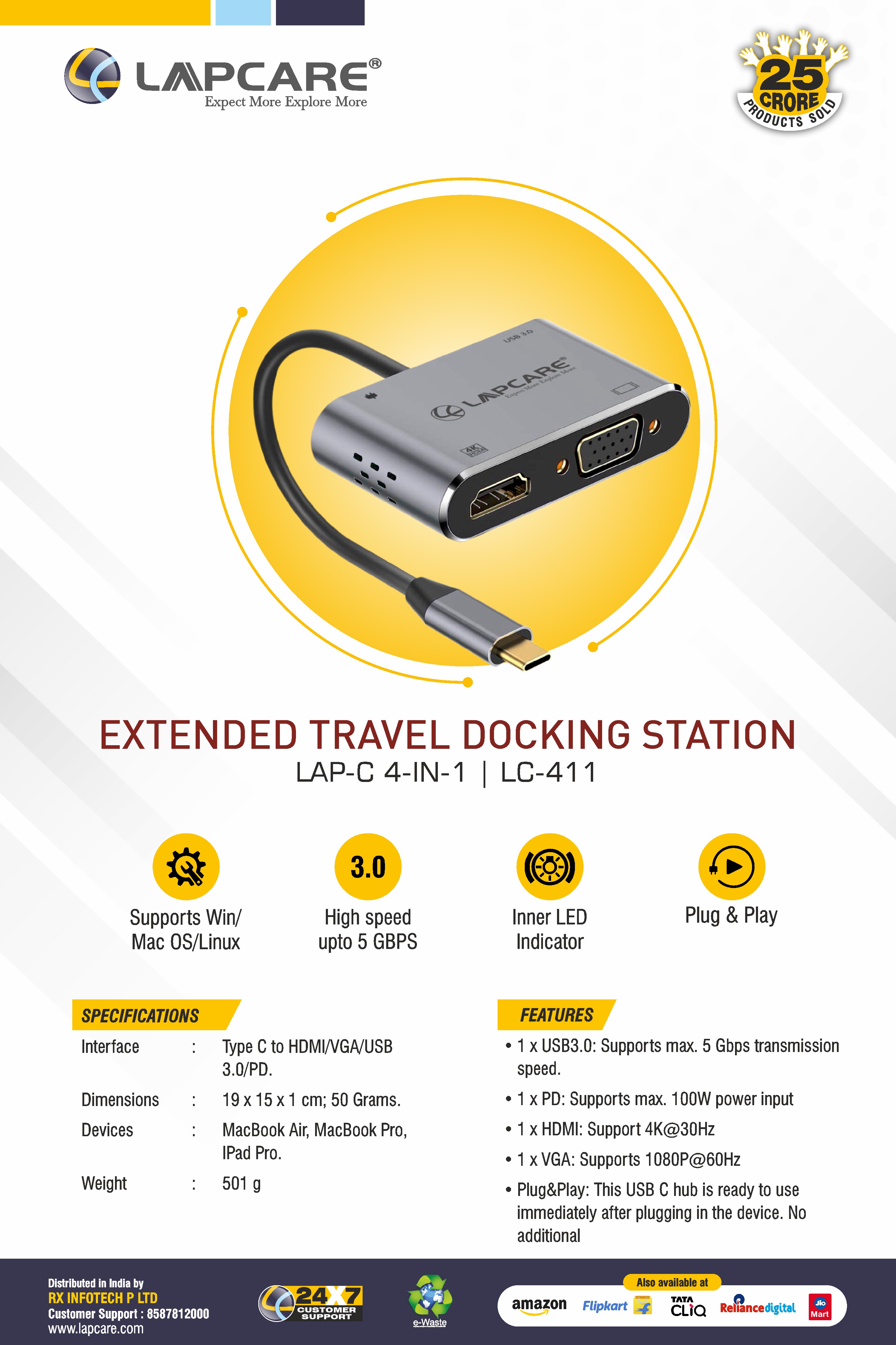 Travel Light without compromising the functionality of your personal device and extend its versatility via the Lapcare Lap-C USB-C docking station. The Lapcare Lap-C gives you extra connectivity of USB-C, VGA, HDMI and Power Delivery ports.