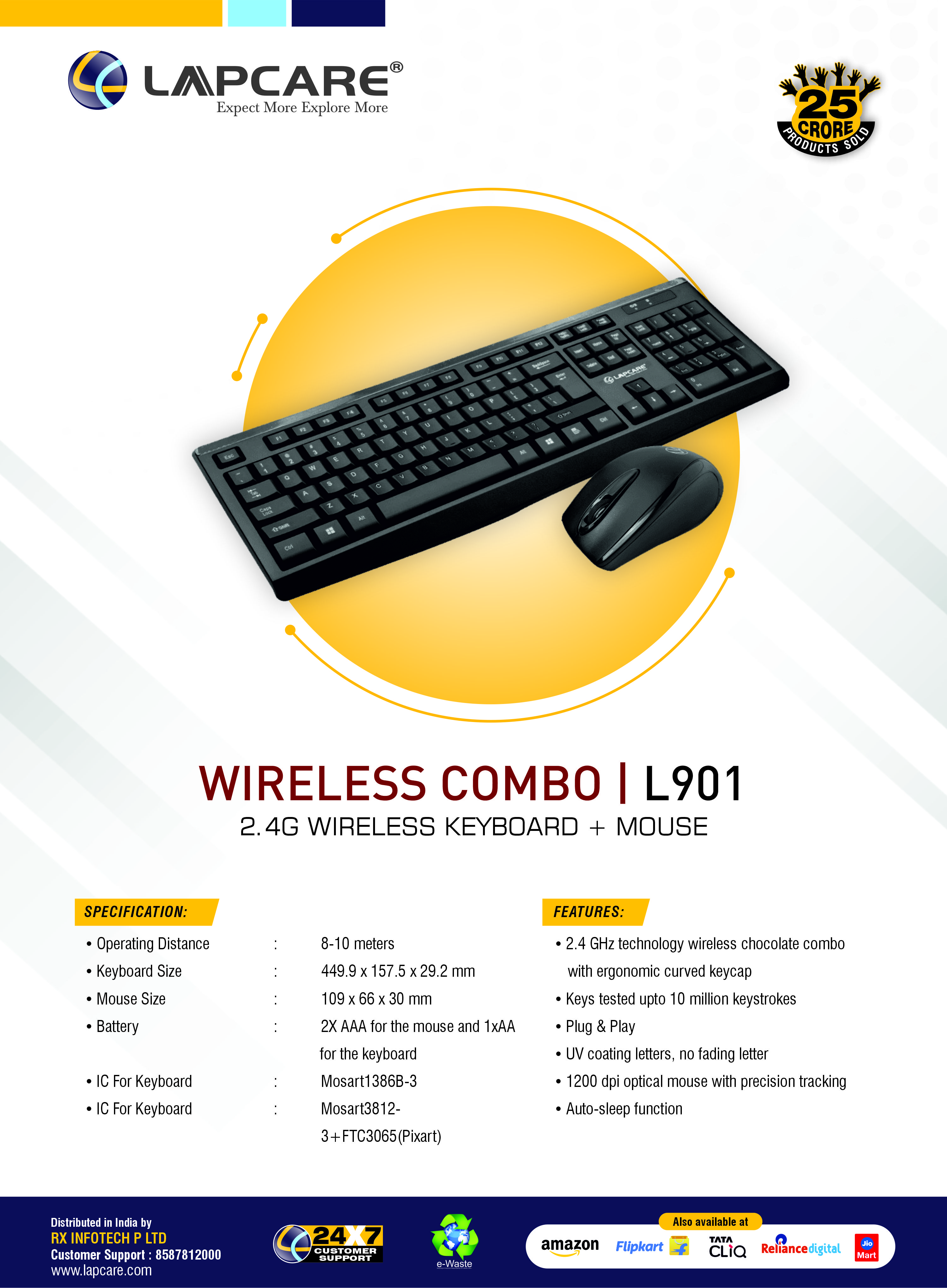 Wireless chocolate combo with ergonomic curved keycap Keys tested upto 10 million keystrokes